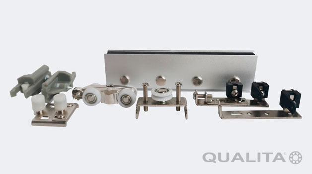 Sistema de ruedas para dos hojas de vidrio, permite abrir o cerrar 2 hojas simultáneamente.